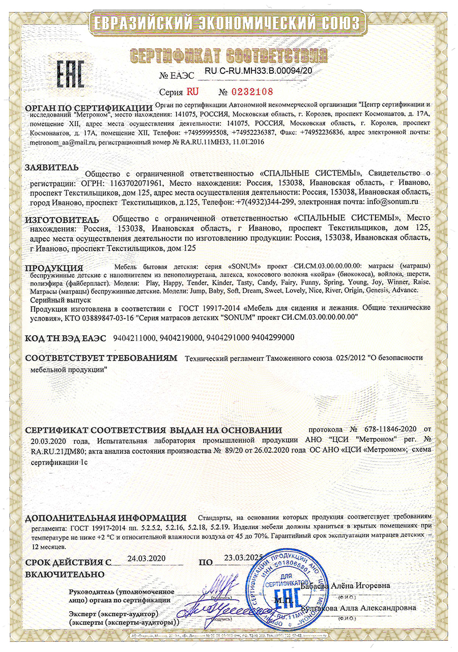 Гарантийные сроки от 18 месяцев до 60 месяцев, с даты, которая указана в накладной, в зависимости от модели матраса